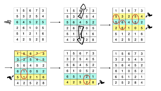 ์ผ์ชฝ์์ ๋ถ์ด ์ค๋ฉด ์ค๋ฅธ์ชฝ์ผ๋ก ํ ์นธ์ฉ ๋ฐ๊ณ , ์ค๋ฅธ์ชฝ์์ ๋ถ์ด ์ค๋ฉด ์ผ์ชฝ์ผ๋ก ํ ์นธ์ฉ ๋ฏผ๋ค.