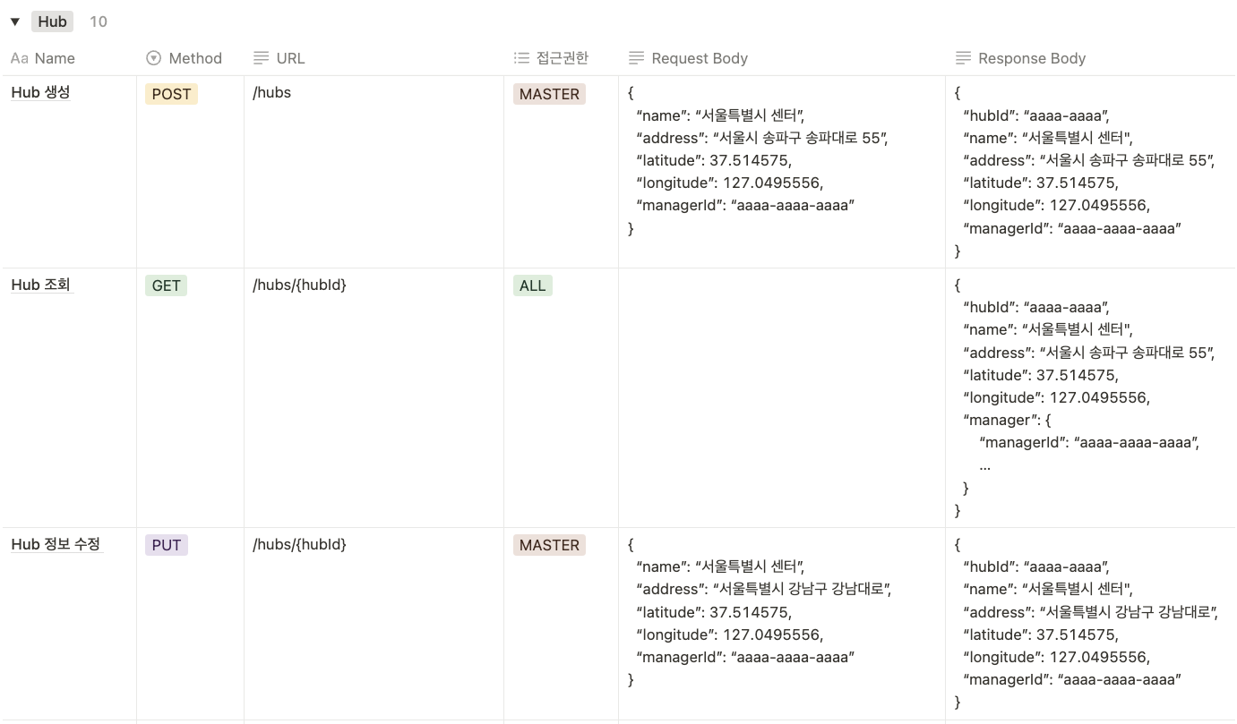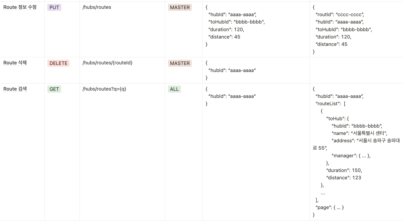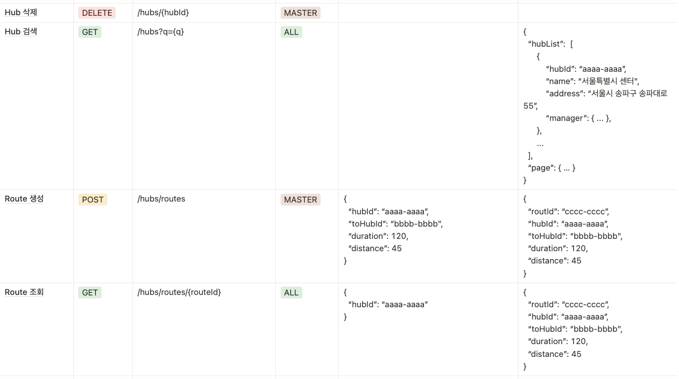 | hub-service | · 허브 (Hub) · 허브이동정보 (Route) |